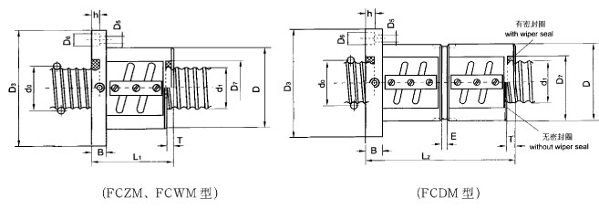 | 注①L3=L1×2+E ②法兰形状可根据用户需要特制。 ③Kc是在预紧力Fp为0.1Ca,轴向载荷F为0.3Ca,循环列数为3列时的理论计算值,当轴向载荷F不等于0.3Ca时:Kc=K( )1/3,当循环列数为5列时,Kc≈1.6K,K为表中刚度值。④表中K值适用于CDM型丝杠副,其它型号未列入,需要时与本公司联系。 |