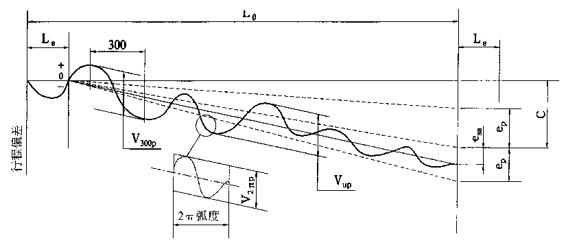 | ● 滚珠丝杠副导程精度主要考核四大指标,即2p 弧度内行程变动量V2pP; 任意300行程内变动量V300P;有效行程内行程变动量Vup ; 有效行程内平均行程偏差eP。如图所示(←点击此处) |